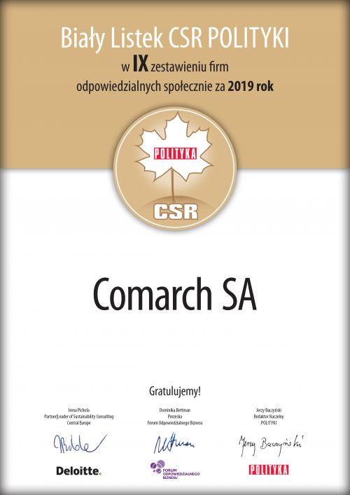 Oprócz tego Comarch świeci przykładem jako firma rzetelna i uczciwa względem pracowników, konkurencji, a także środowiska. Przejawem tego jest nagroda tygodnia Polityka – Biały Listek CSR, przyznawana we współpracy z Forum Odpowiedzialnego Biznesu oraz audytorem finansowym, firmą Deloitte.